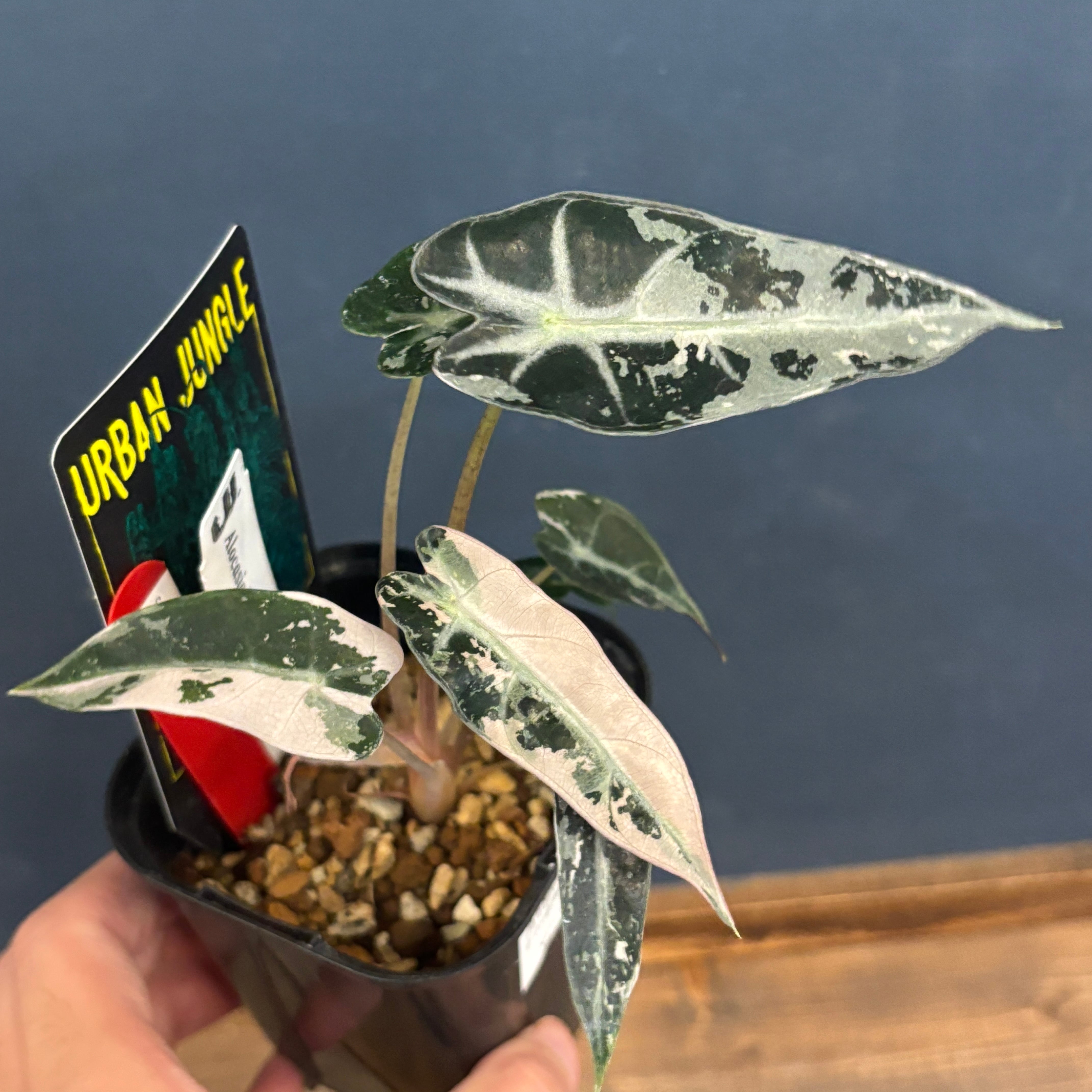 アマゾニカを小型にしたような品種で、濃い緑色は葉が特徴的で、こちらはさらに薄いピンク色の斑が入る希少な品種になります。