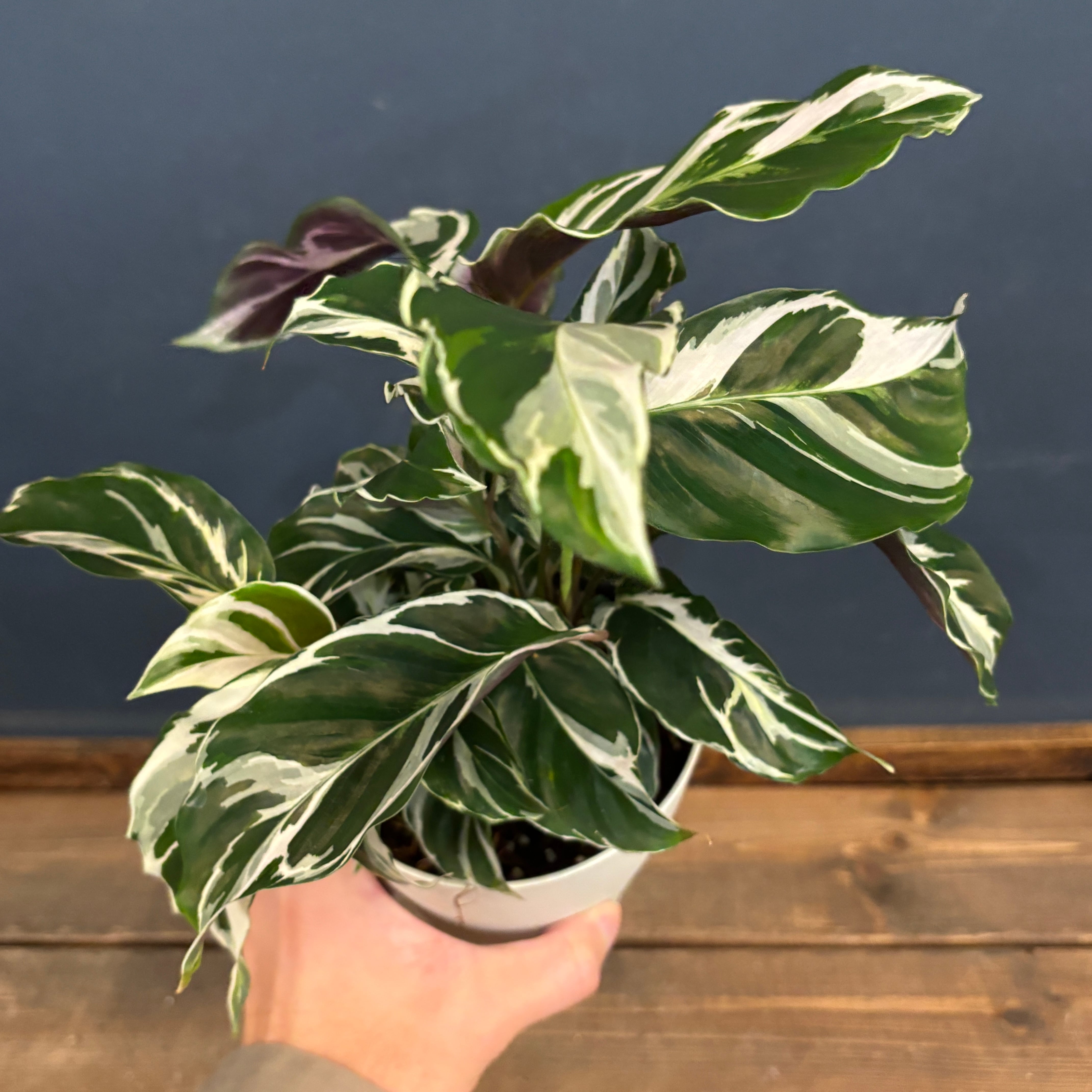 細く波打つ緑色の葉に白い斑が入り、葉裏が紫色になるとても人気で美しい品種になります。