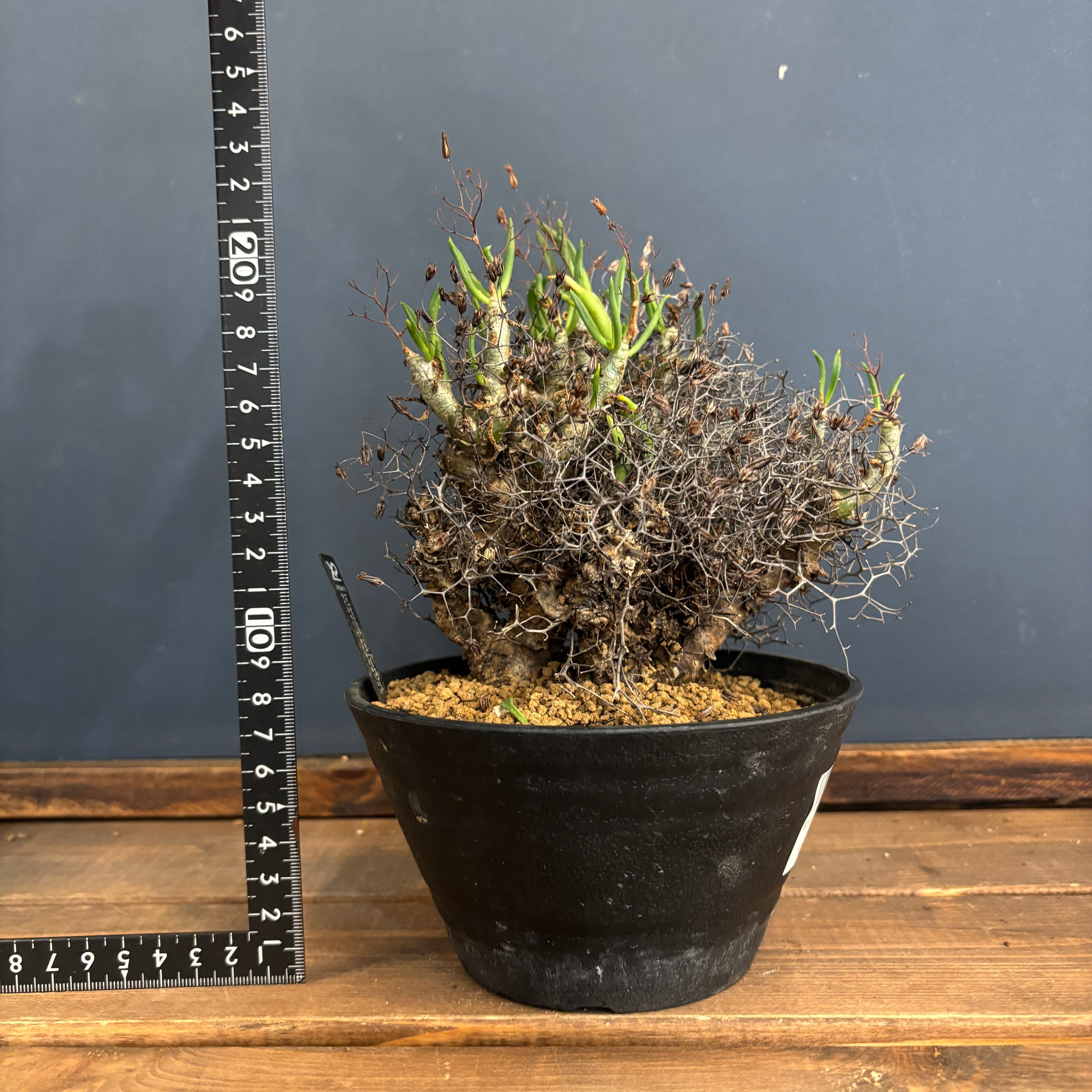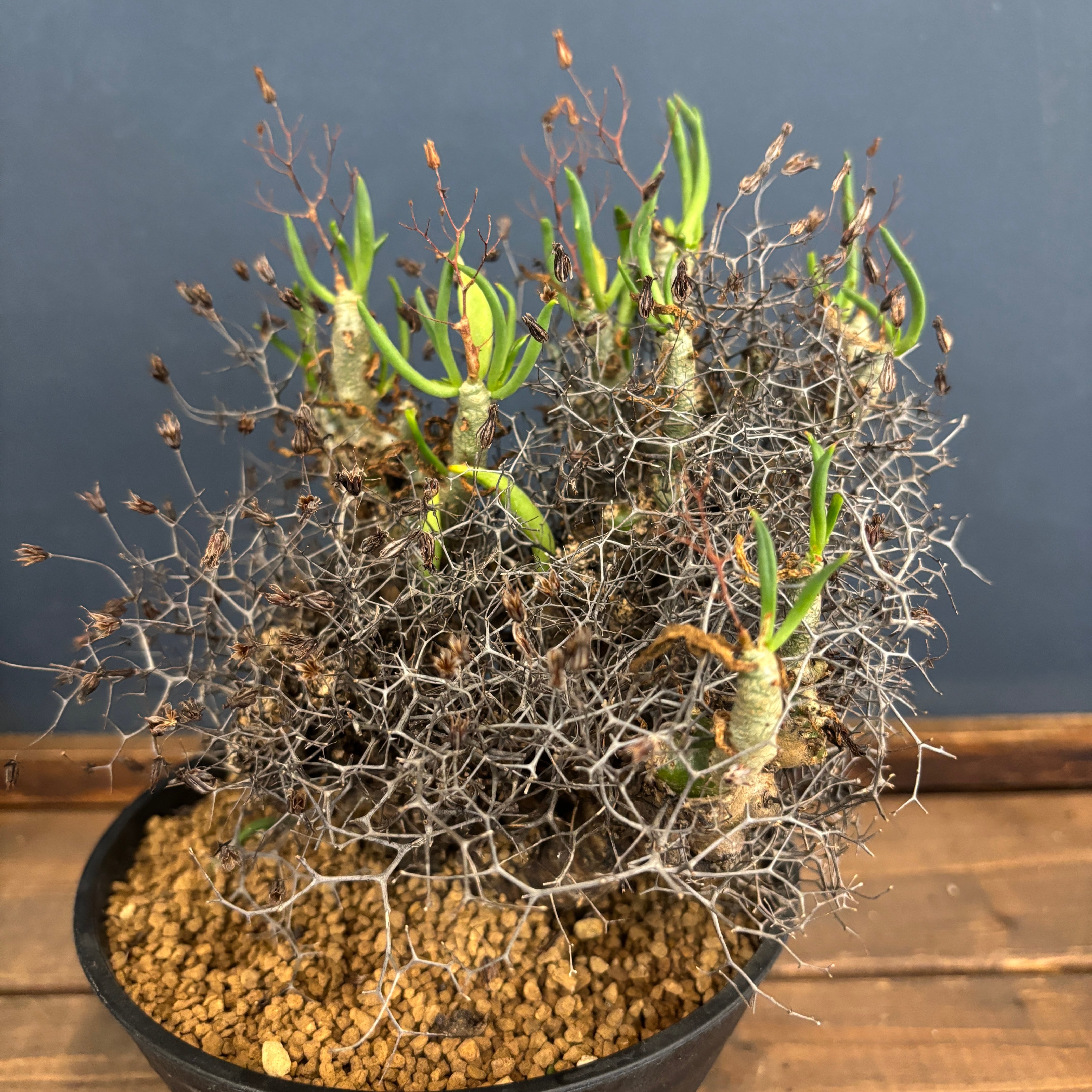 花柄が枯れ、棘のように無数に残り、とてもかわいらしい多肉質の葉を展開していきます。