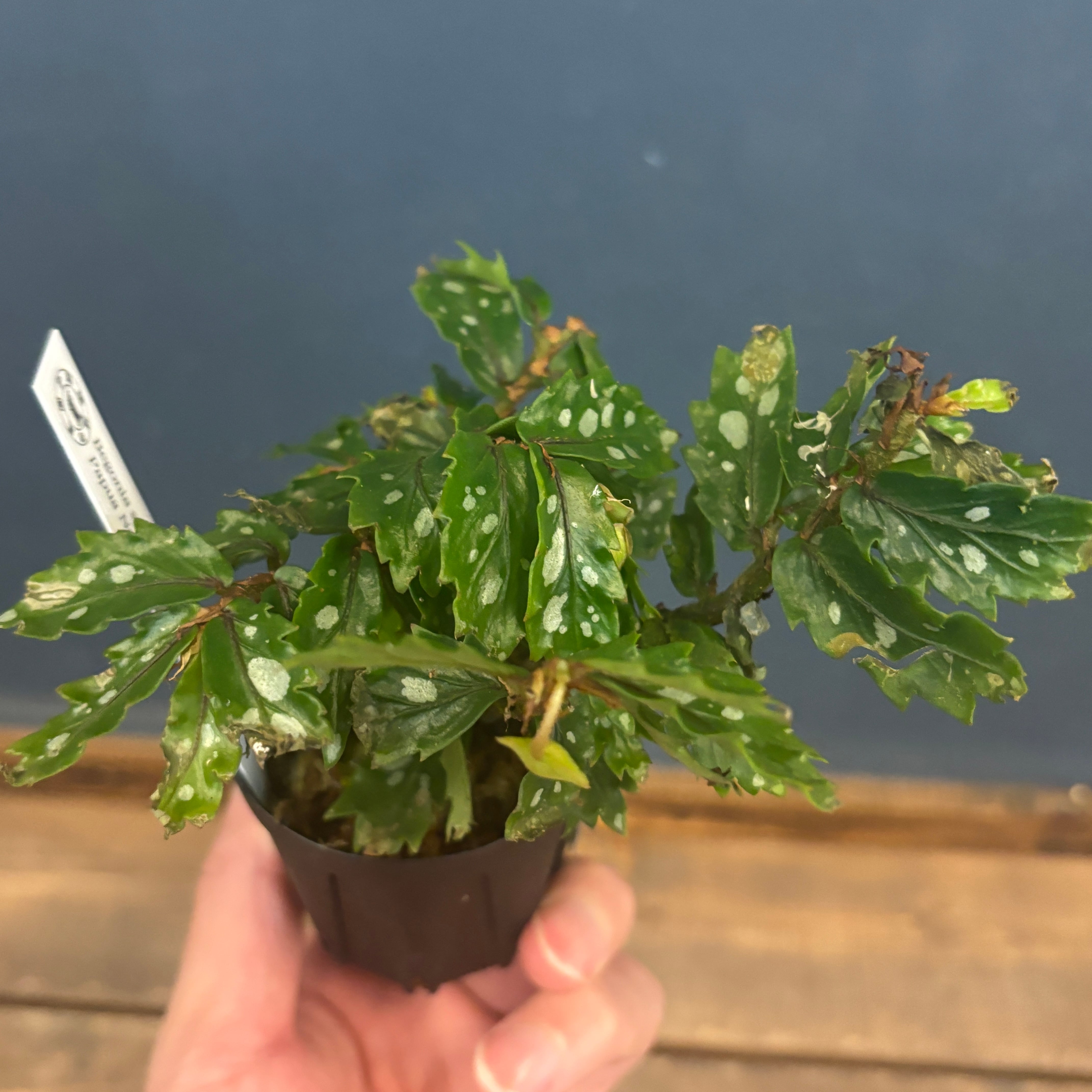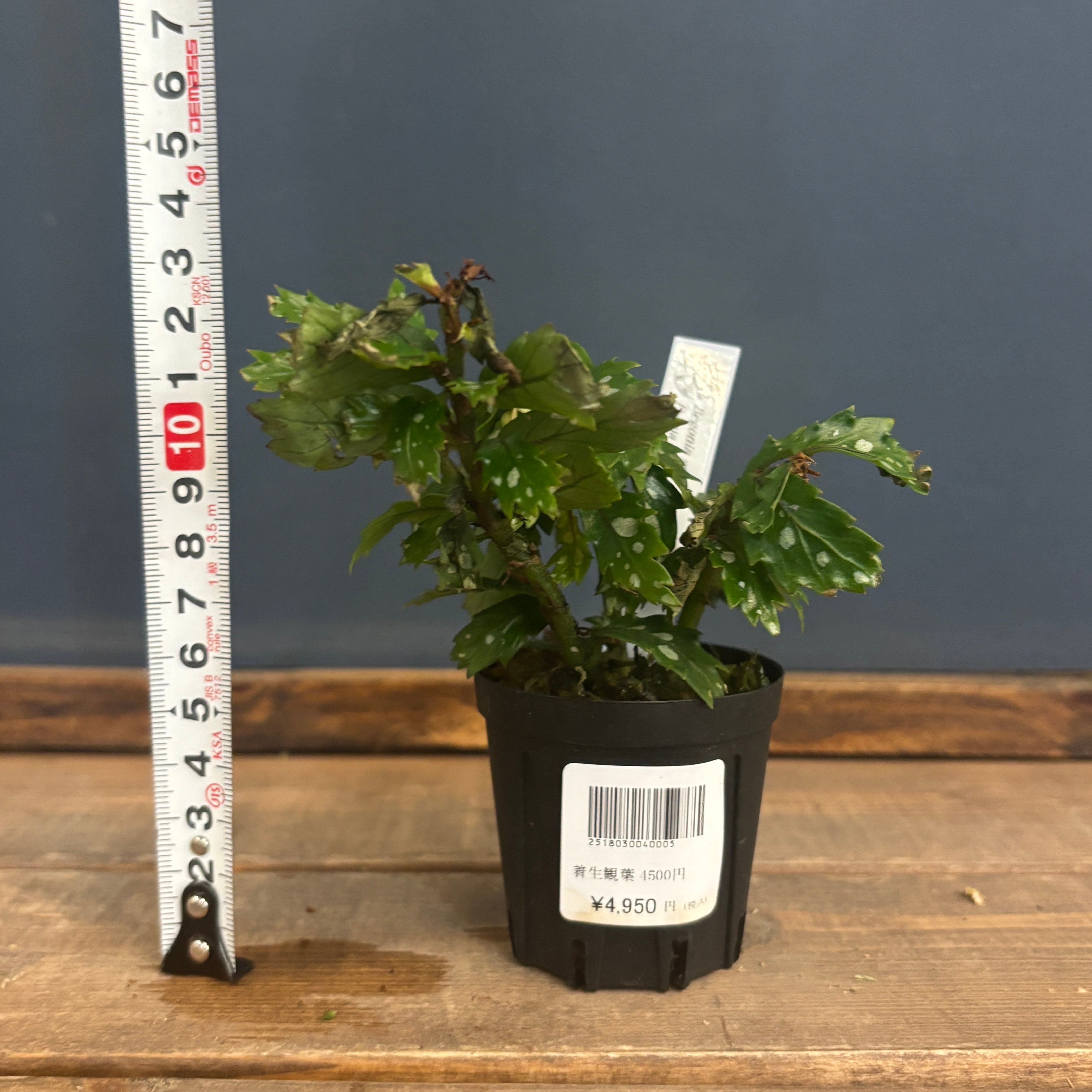 細かくギザギザとした葉に銀色の模様が入るのが特徴的で、あまり流通していない品種です。