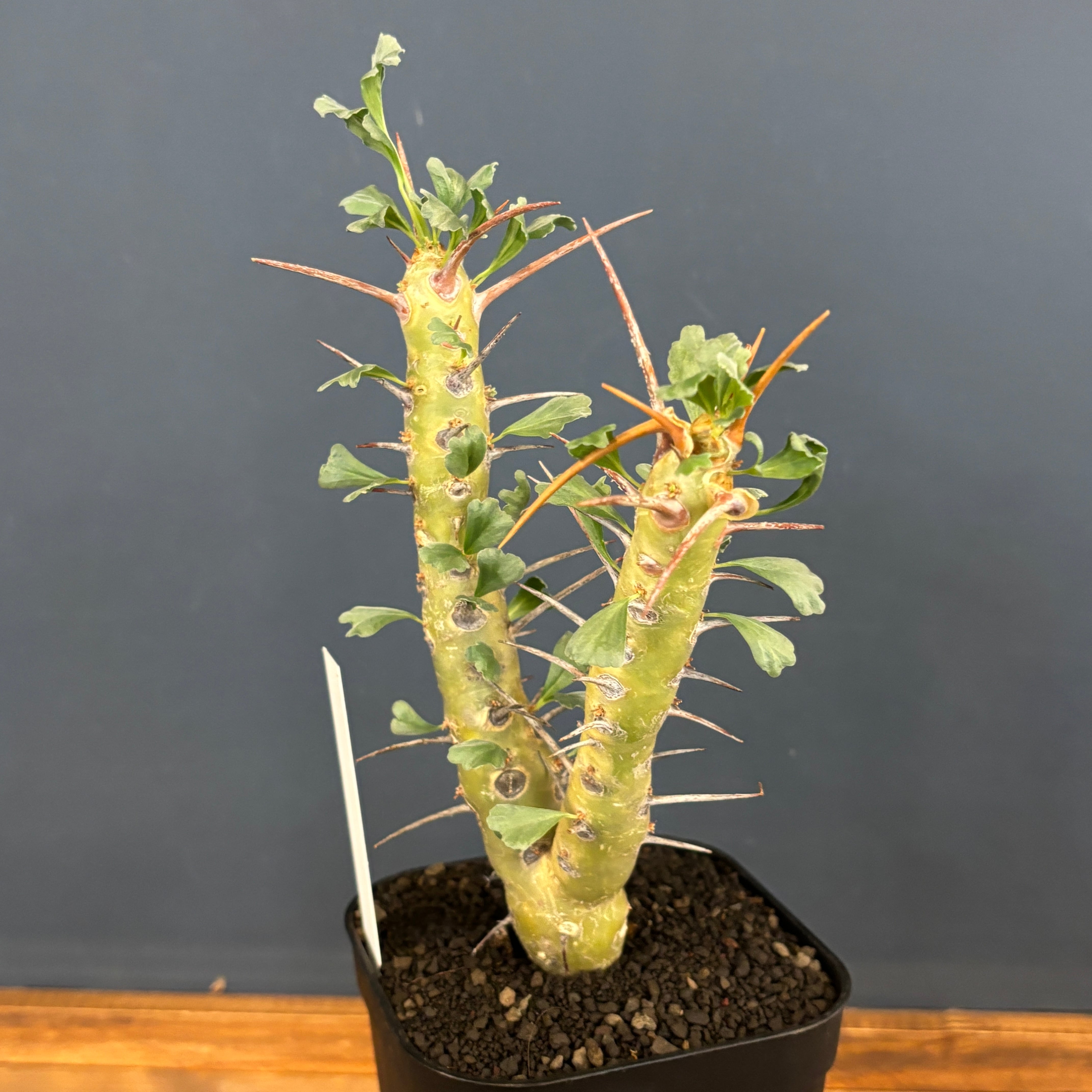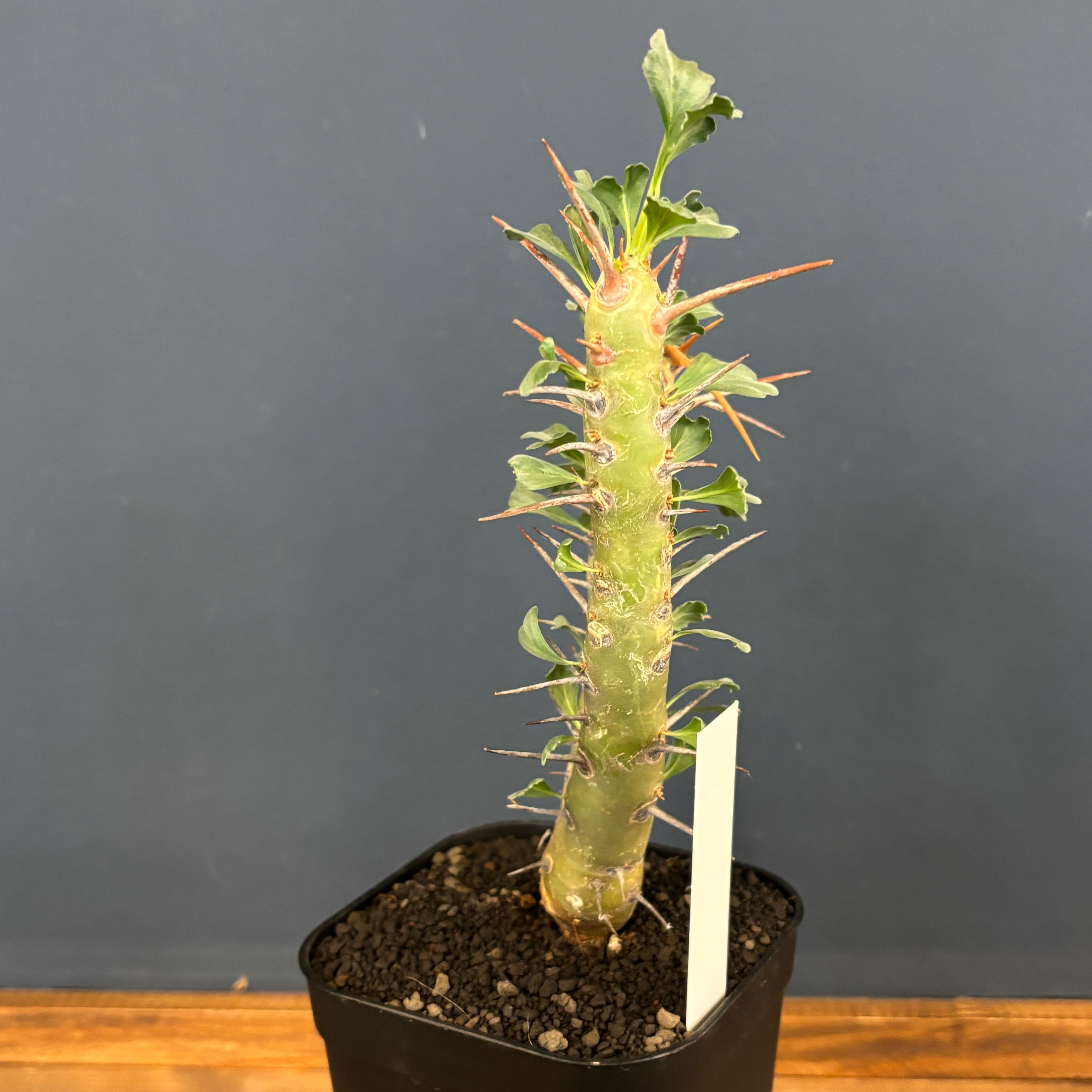 太くワックス状の表皮の幹から太く鋭い棘と小さめの葉を展開していきます。