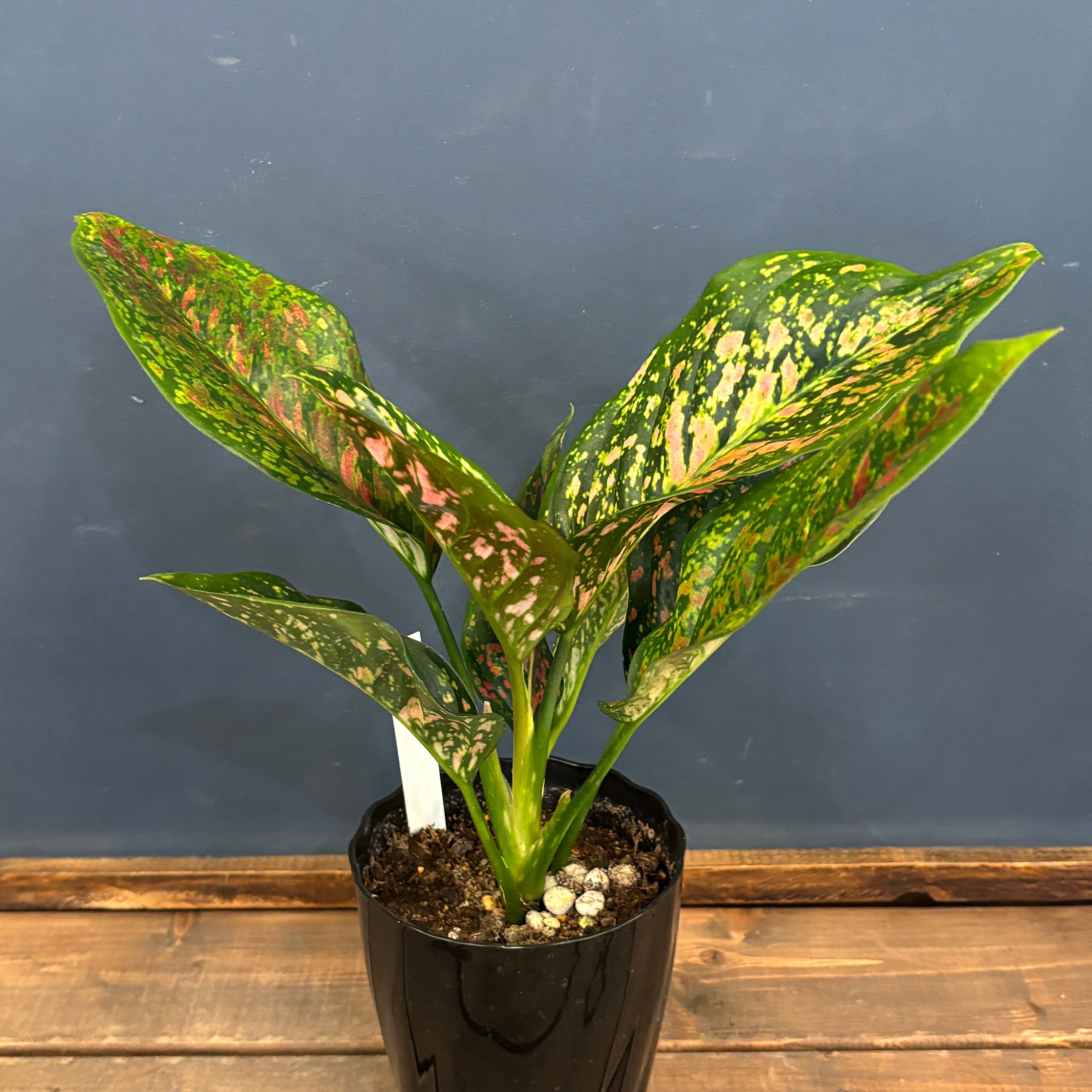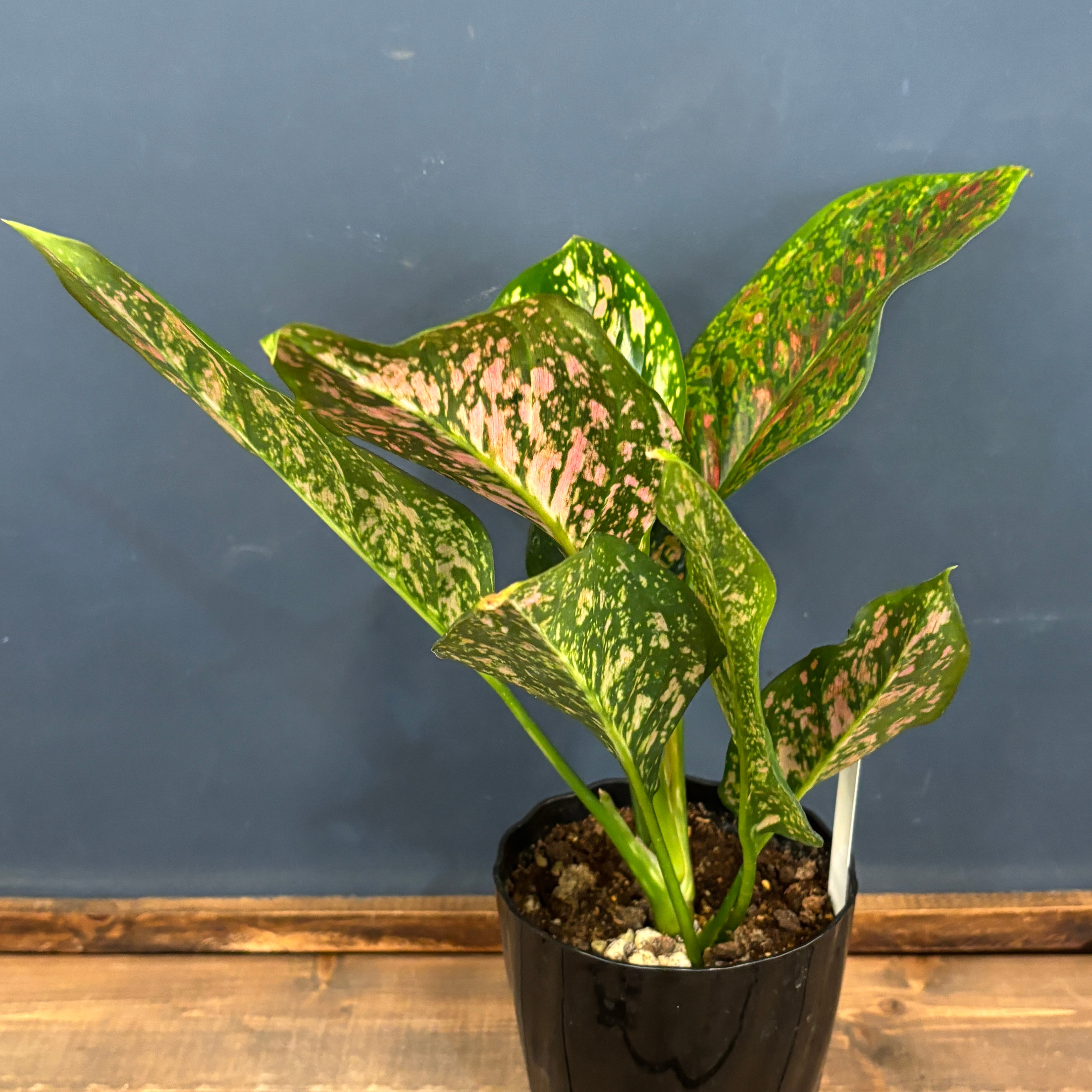 緑色ベースの葉にピンク色の斑がまだらに入るとても美しい品種です。