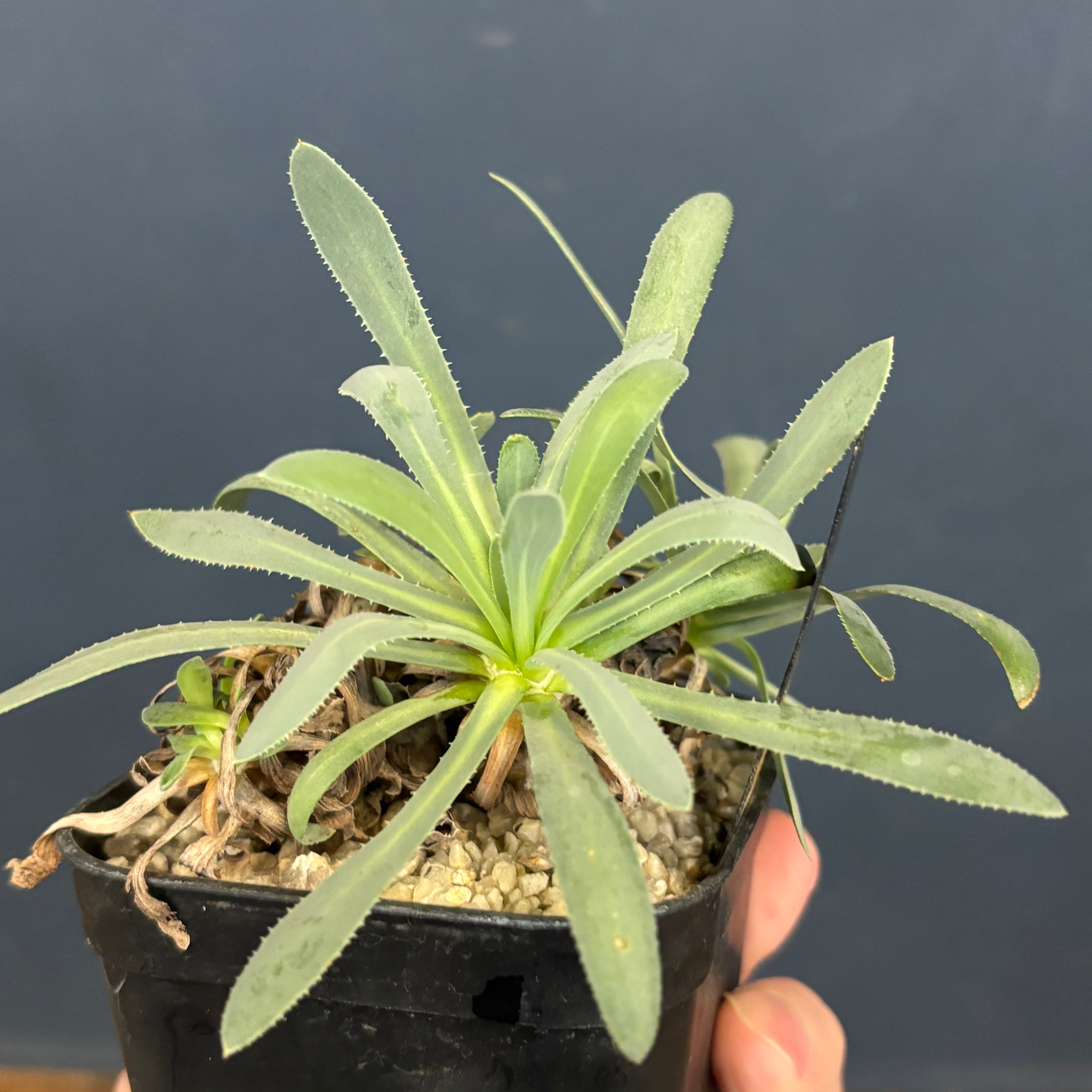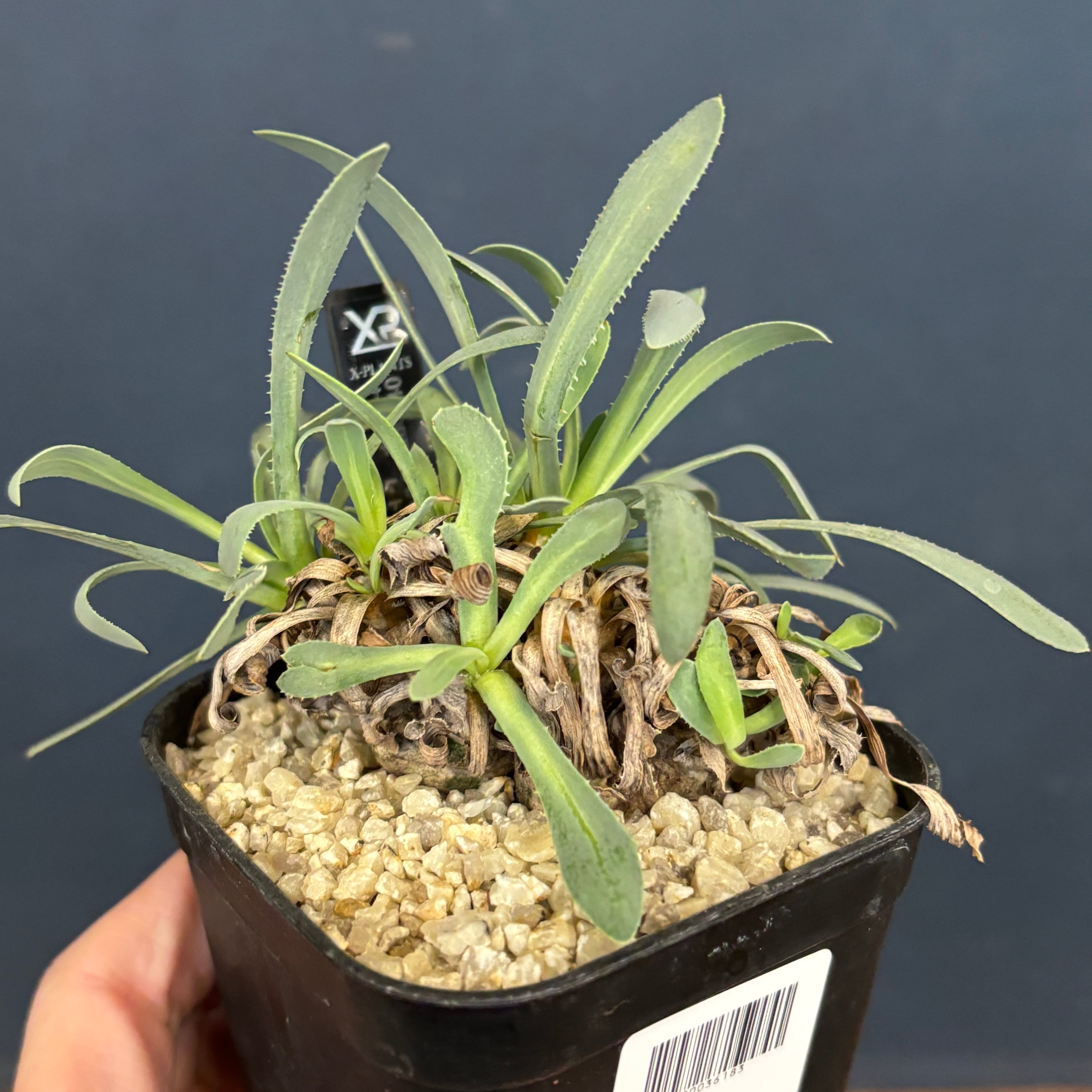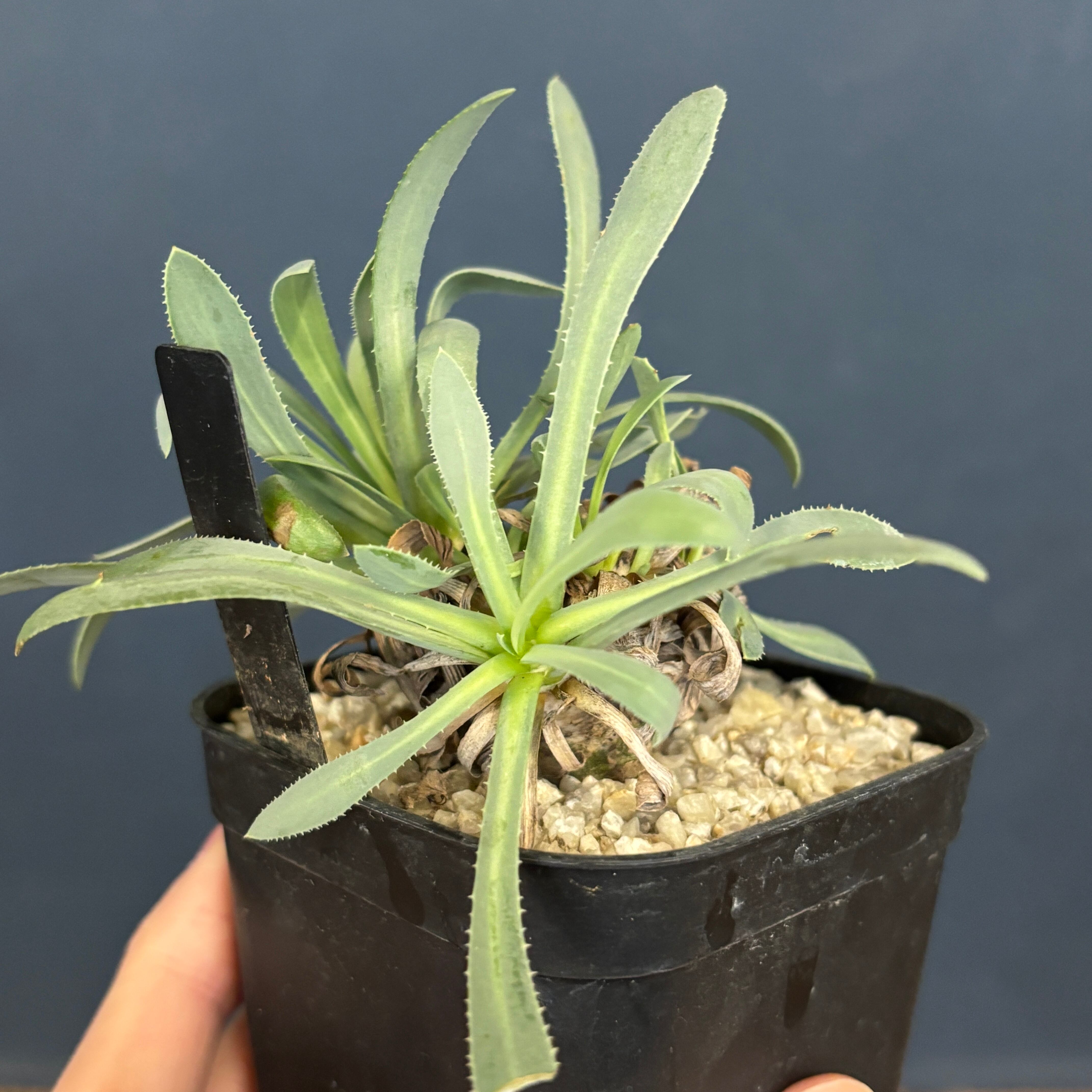 葉が枯れていくと、株元をくるむように残り続ける変わった植物です。