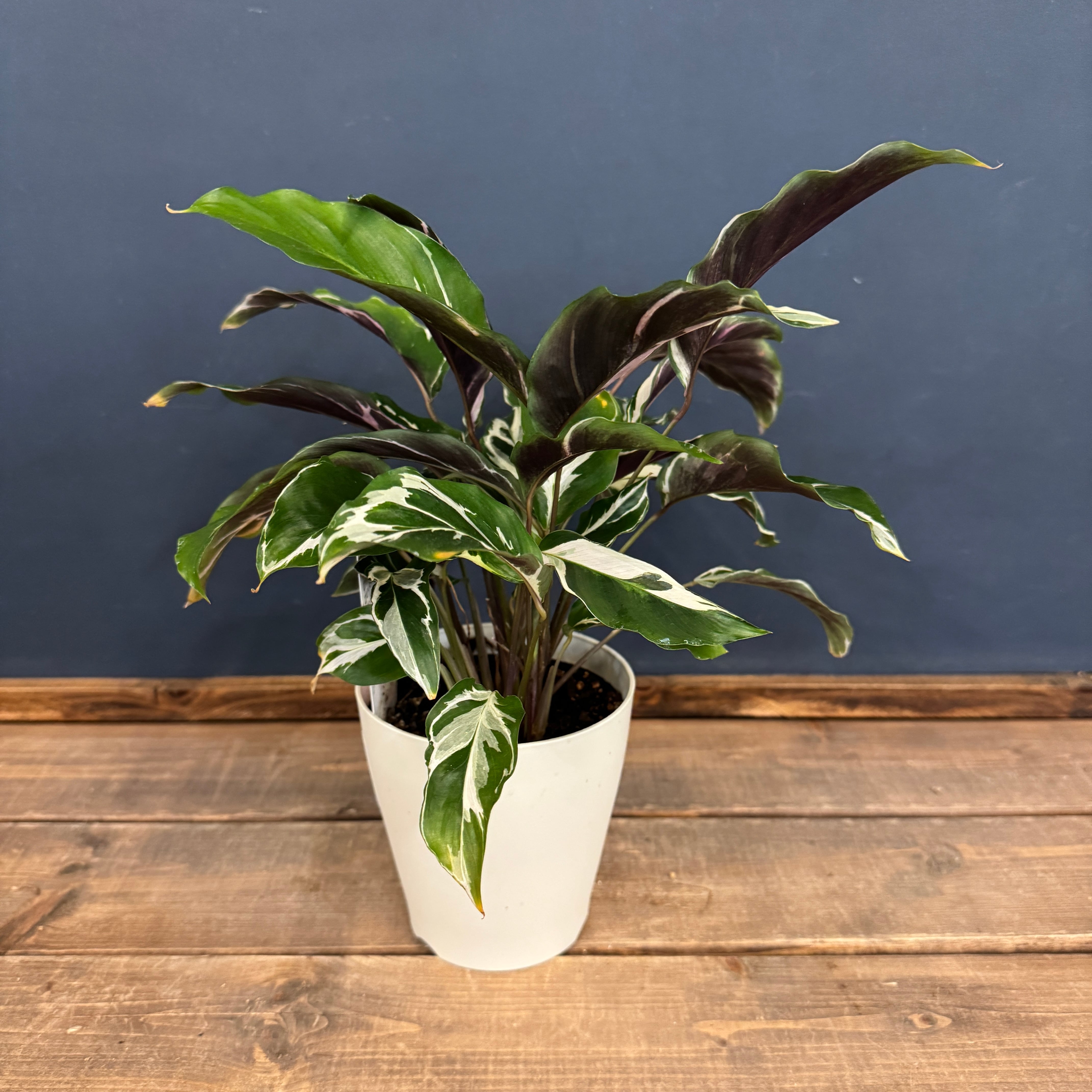 細く波打つ緑色の葉に白い斑が入り、葉裏が紫色になるとても人気で美しい品種になります。