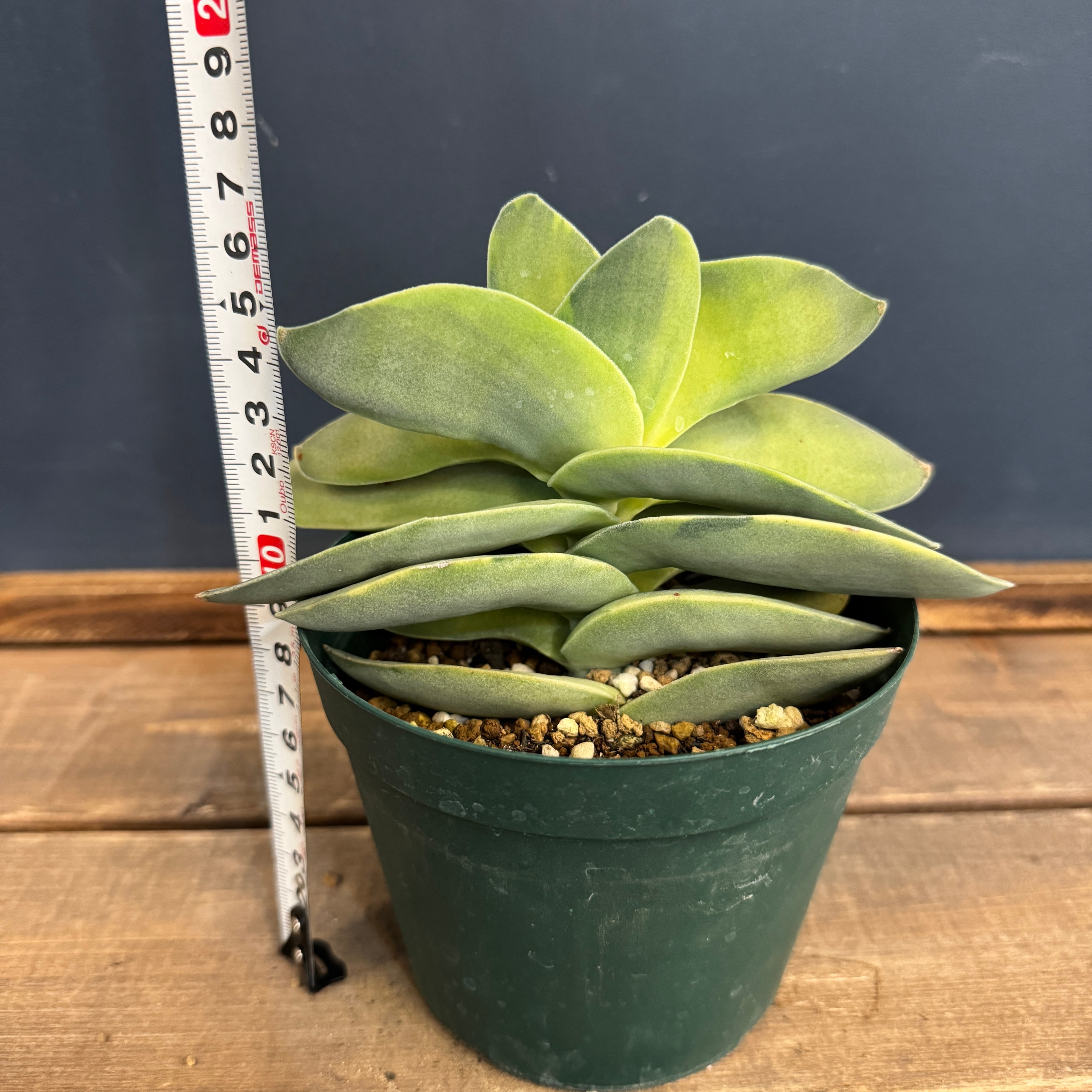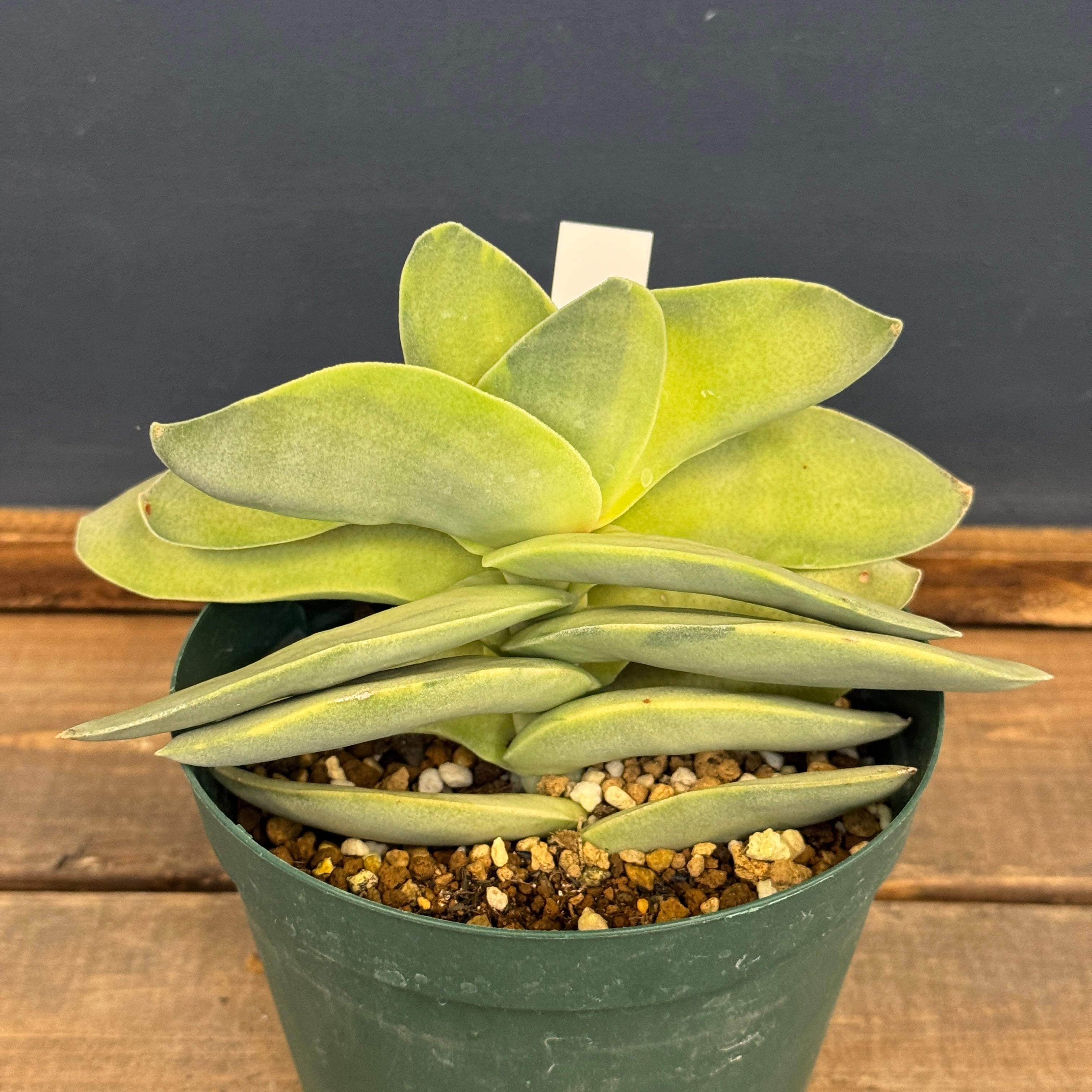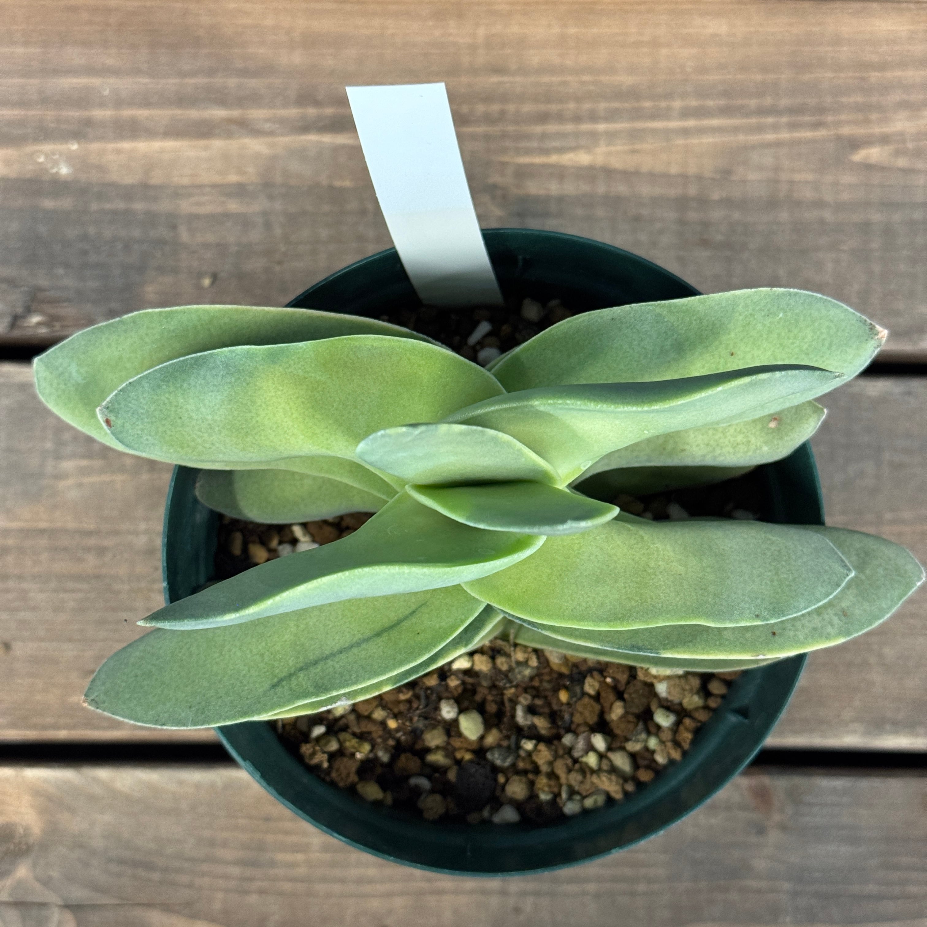 プロペラ状に重なる銀緑色の葉に斑が入る美しいタイプ