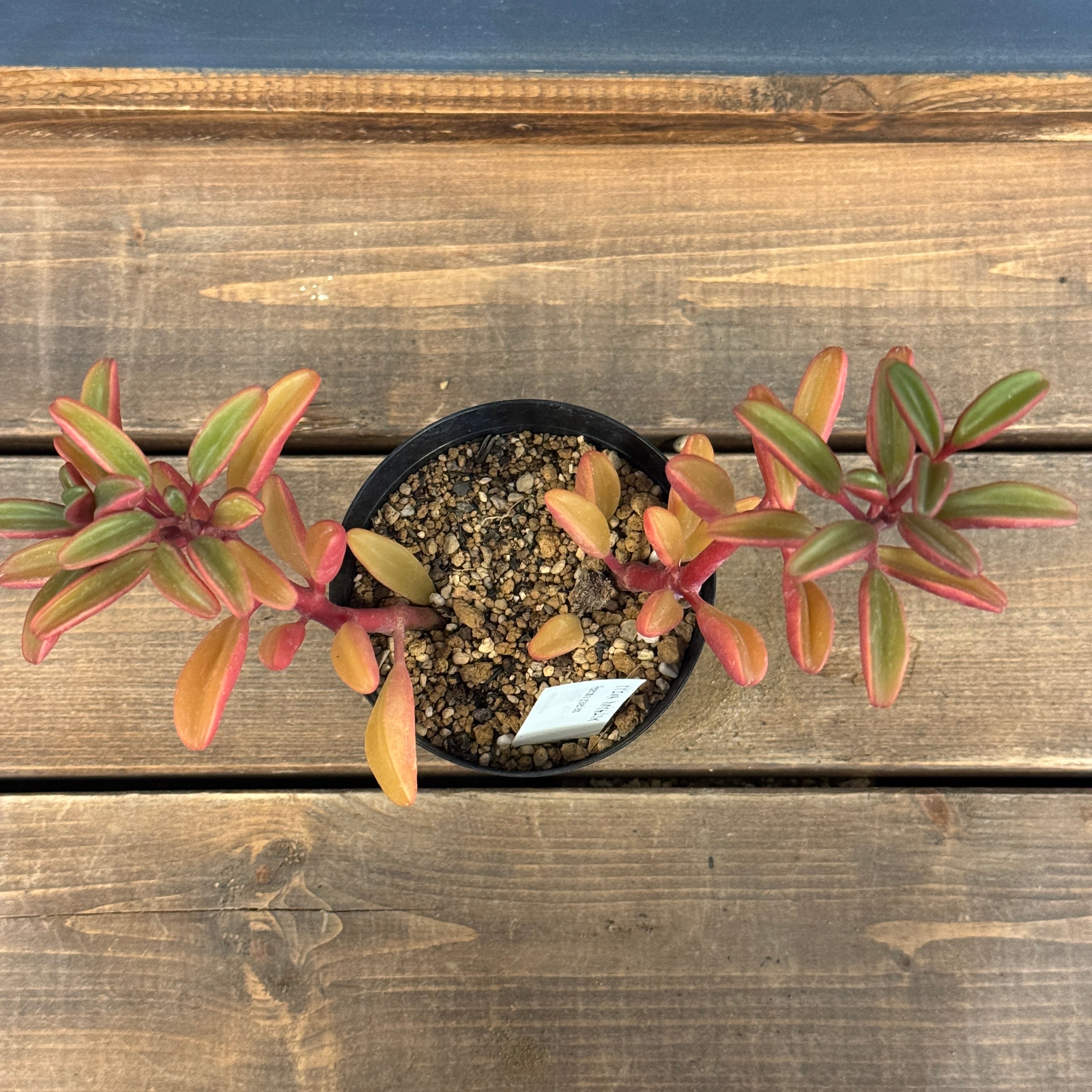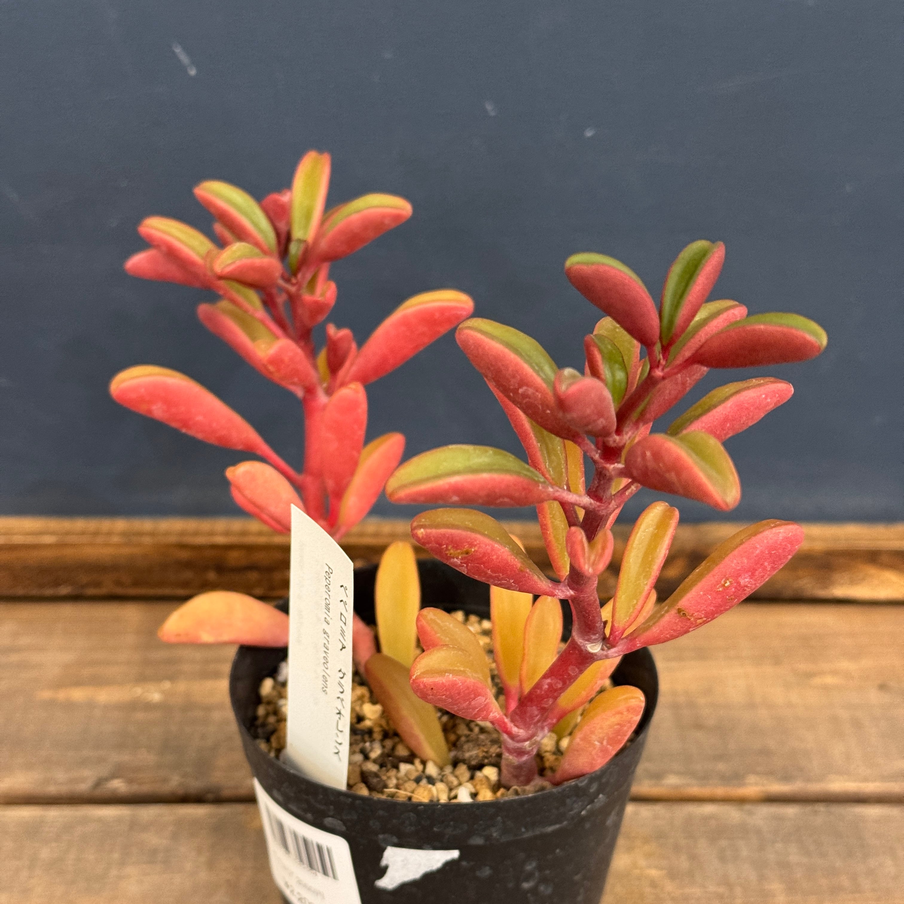 肉厚で光沢のある葉と赤い裏葉が印象的な品種