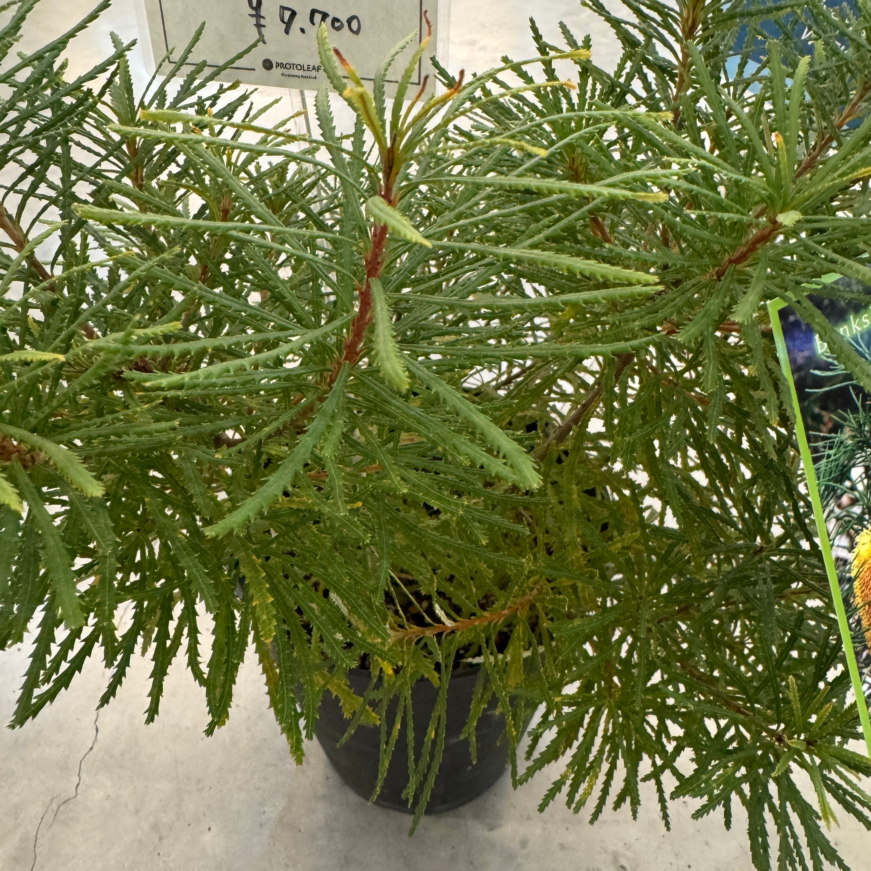 オーストラリア原産のバンクシアで細い葉と円筒形の花穂をつける常緑低木です