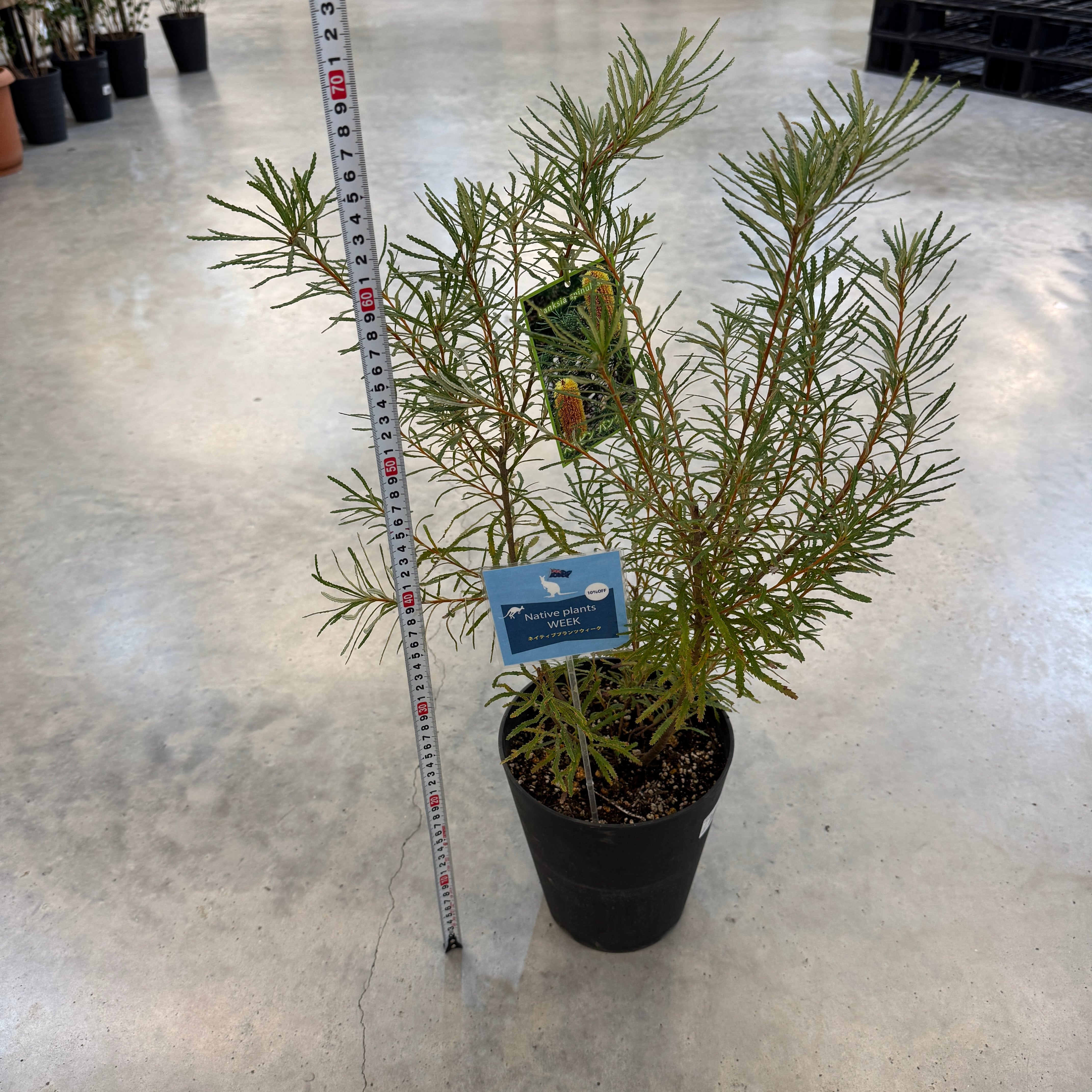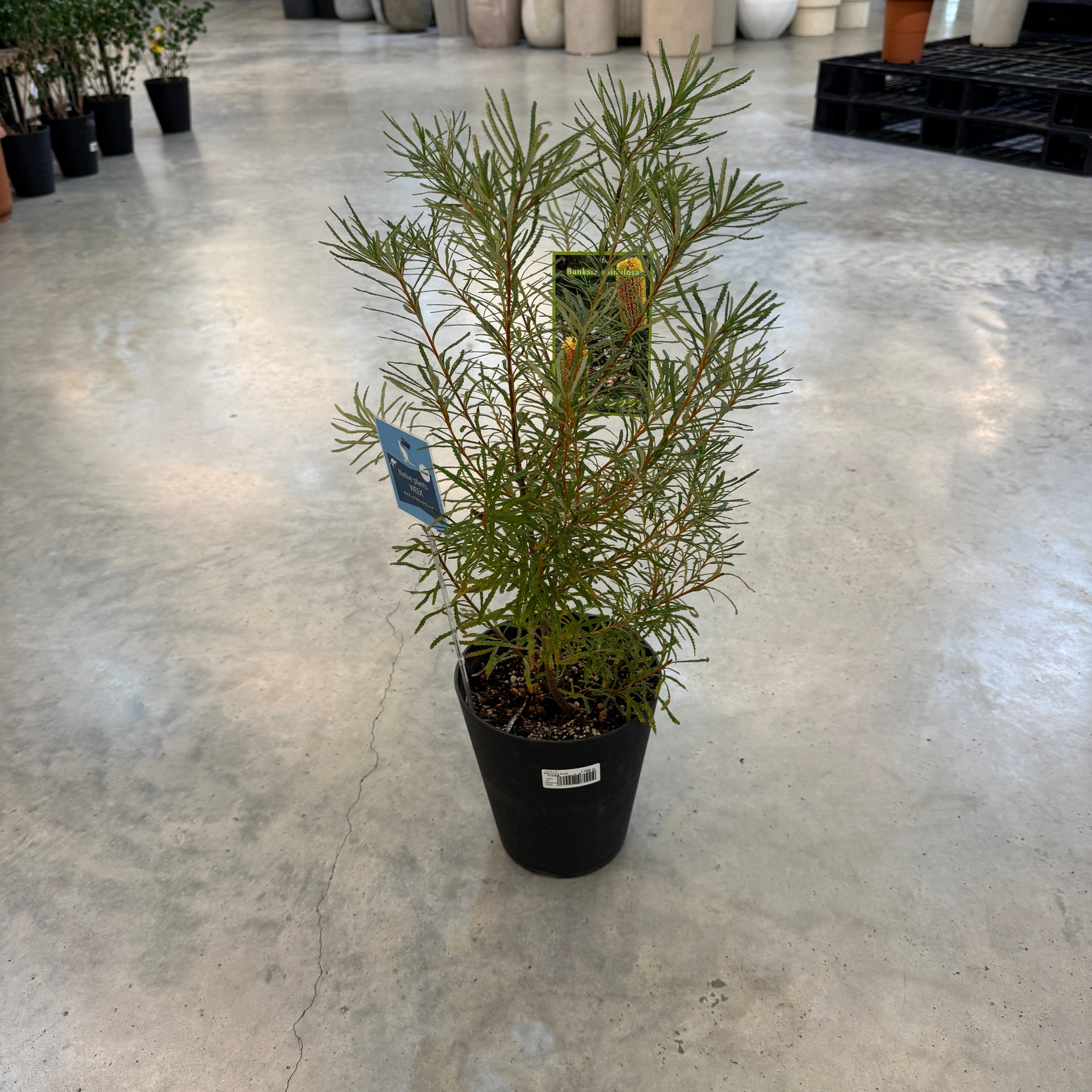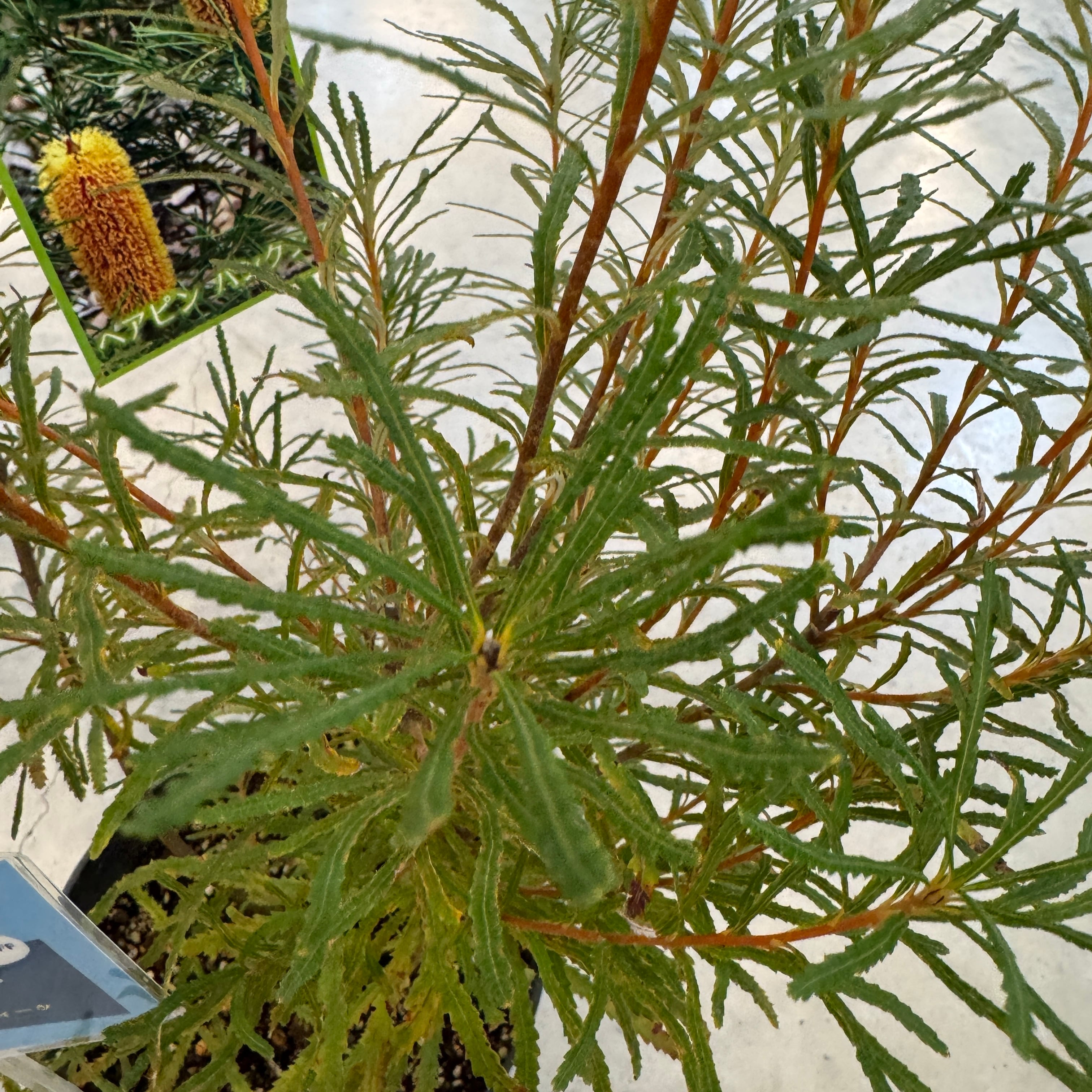 オーストラリア原産のバンクシアで細い葉と円筒形の花穂をつける常緑低木です