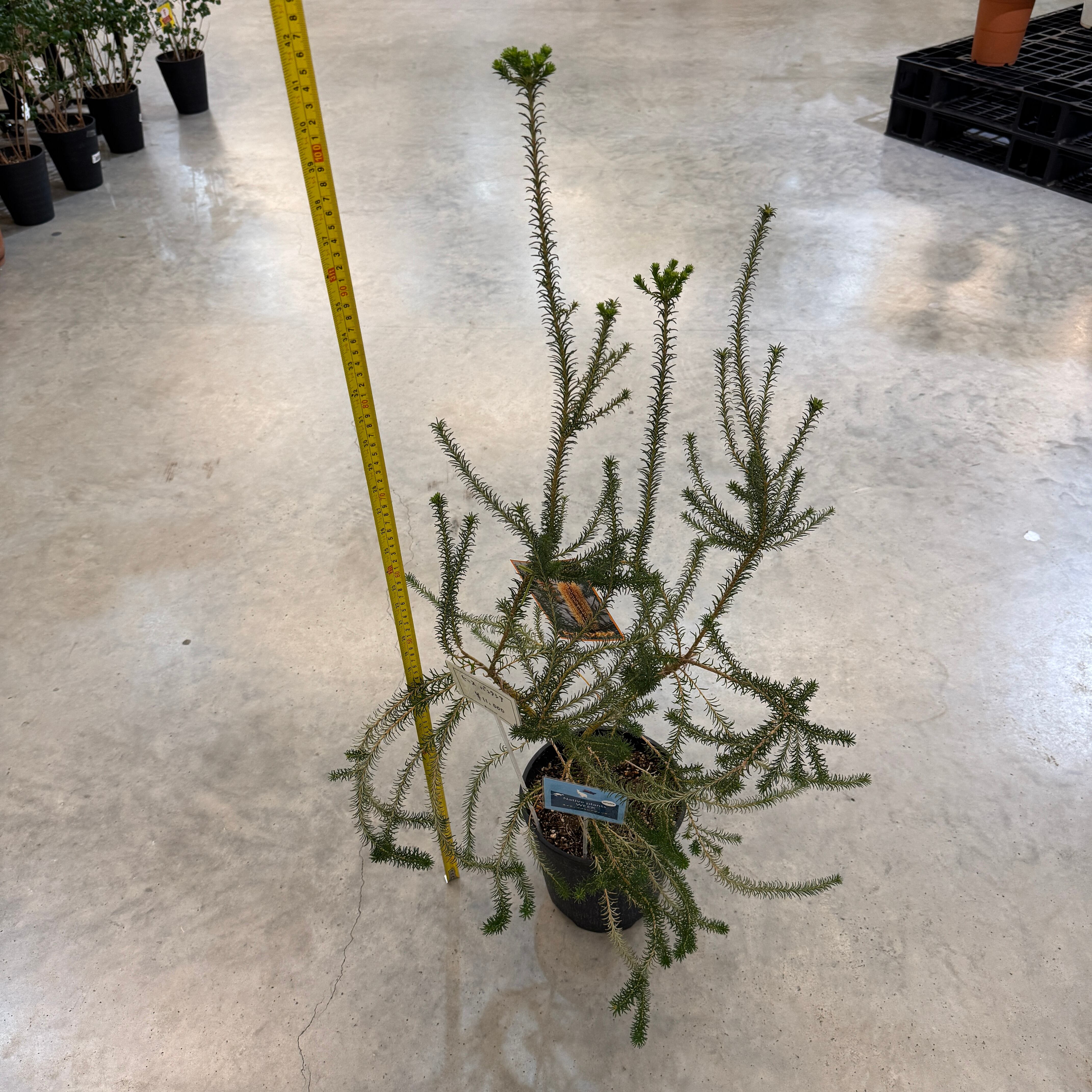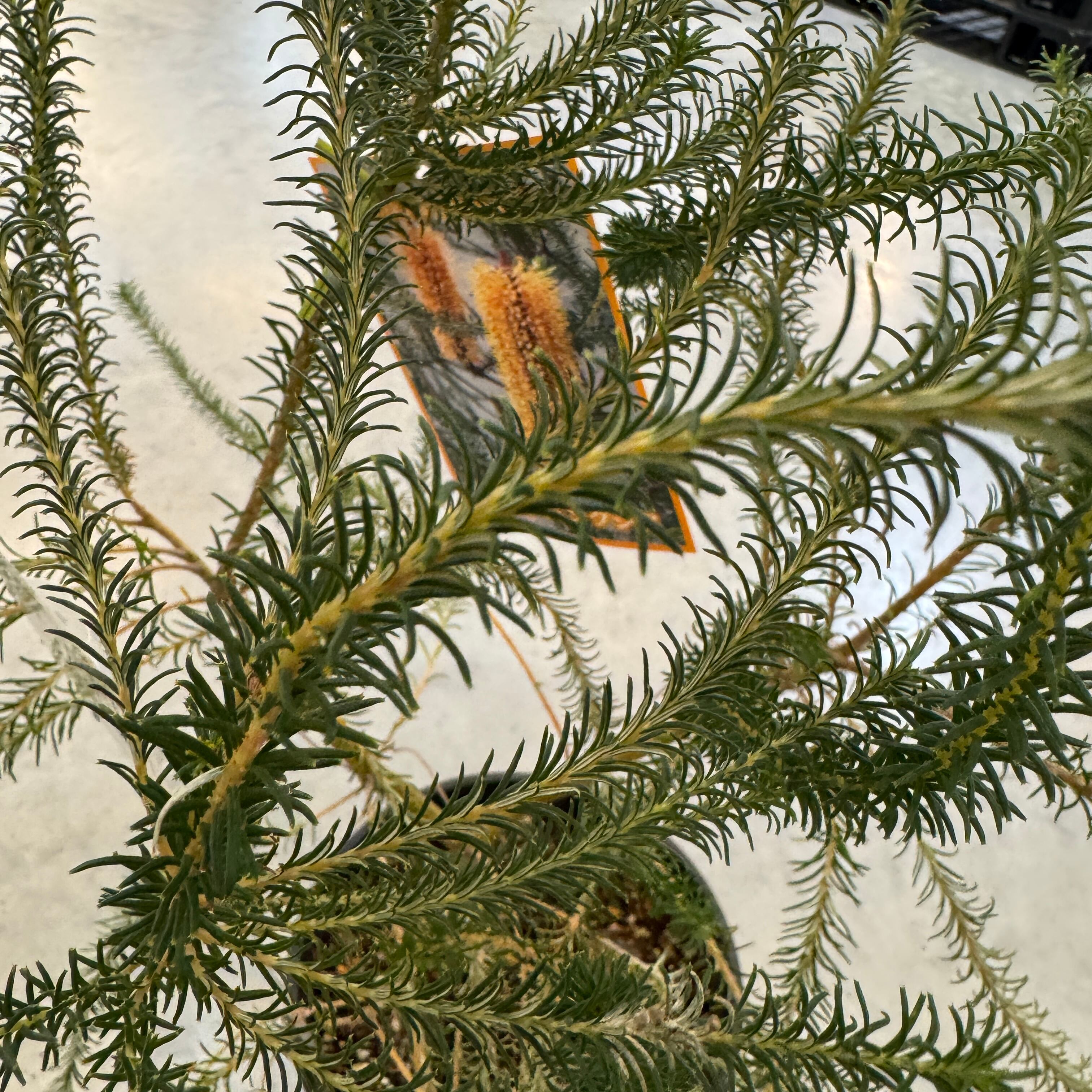 細いヒース状の葉を持つバンクシアでオレンジ色の花穂をつける常緑低木です