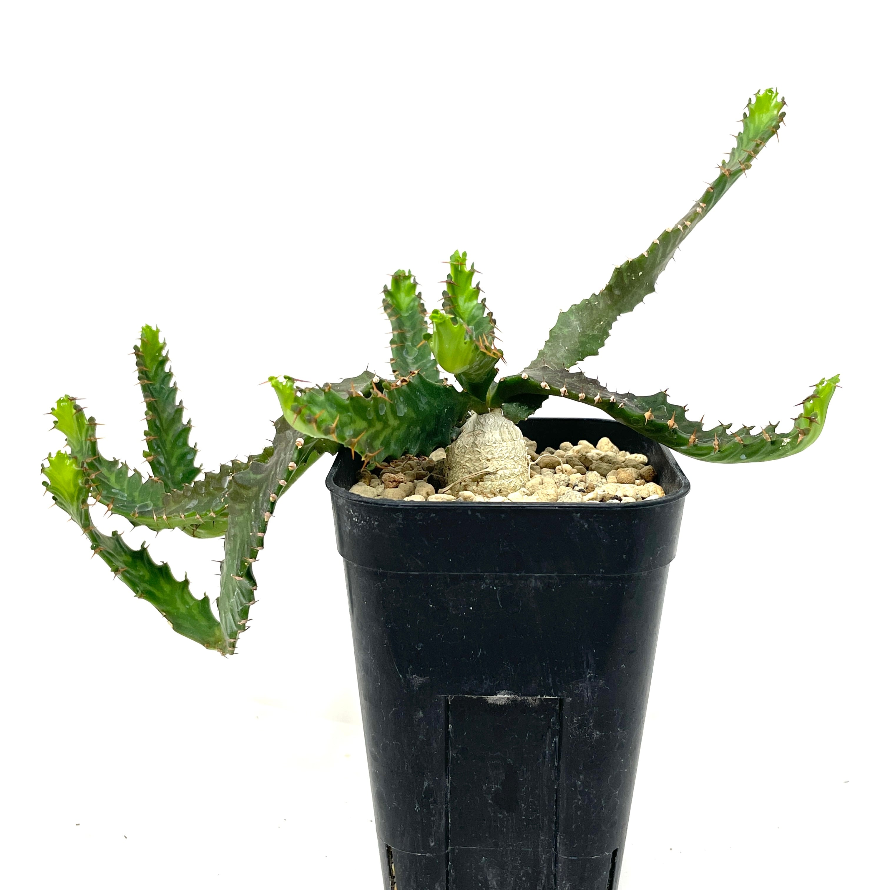 塊根の先端から波打った平たい枝を伸ばしていくユーフォルビアになります。