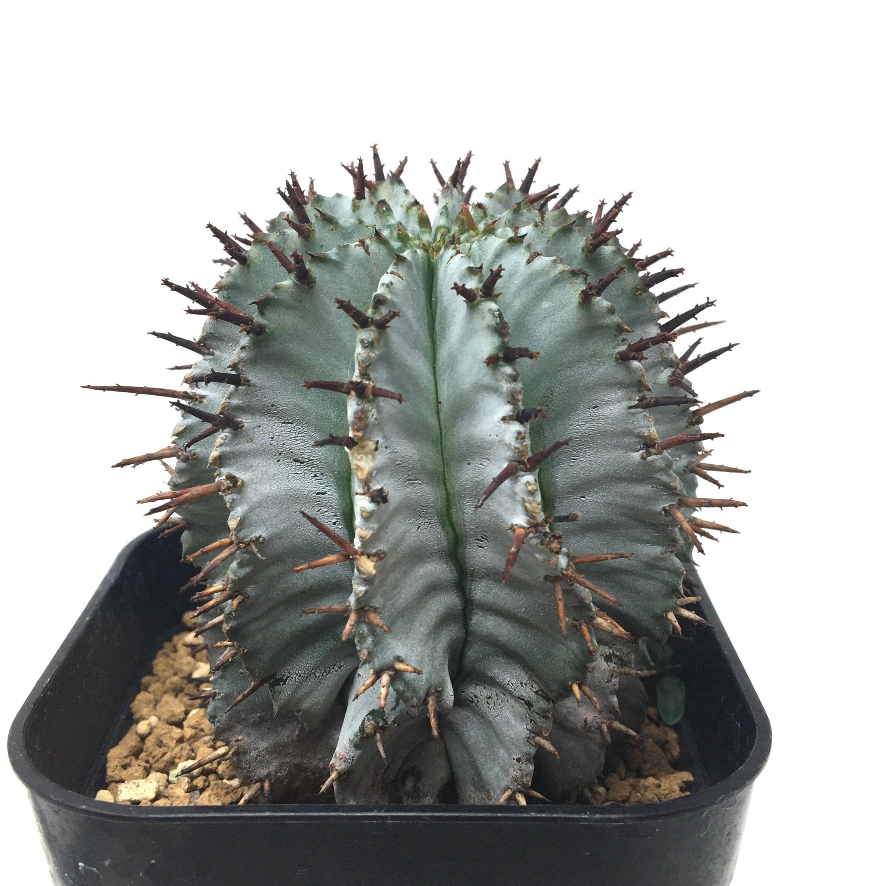 サボテンによく似たユーフォルビアの代表種で、トゲに良く似たものは花茎であり、知らない人からはサボテンと良く間違えられます。縞模様が強く入るもの、トゲの鋭いものなど、種類も様々あり多肉コレクターからも人気なユーフォルビアの一種です。